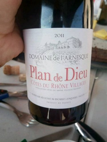 Winemaker Notes: Plan de Dieu, since 2005, is a designated area within the appellation of Côtes du Rhône Villages (the best of Côtes du Rhône). Arnesque's is a blend of 70% Grenache, 25% Syrah & 5% Carignan all de-stemmed. The average age of the vines is 36 years planted in clay, limestone and garrigue soil. Grenache the preeminent red wine grape of the Southern Rhône, makes full-bodied, red-fruited wine. It enjoys very dry, hot and windy conditions but the vines produce scant fruit which means great concentration. The Syrah provides structure, savoriness and black fruit, while the touch of Carignan adds tannin and acidity.